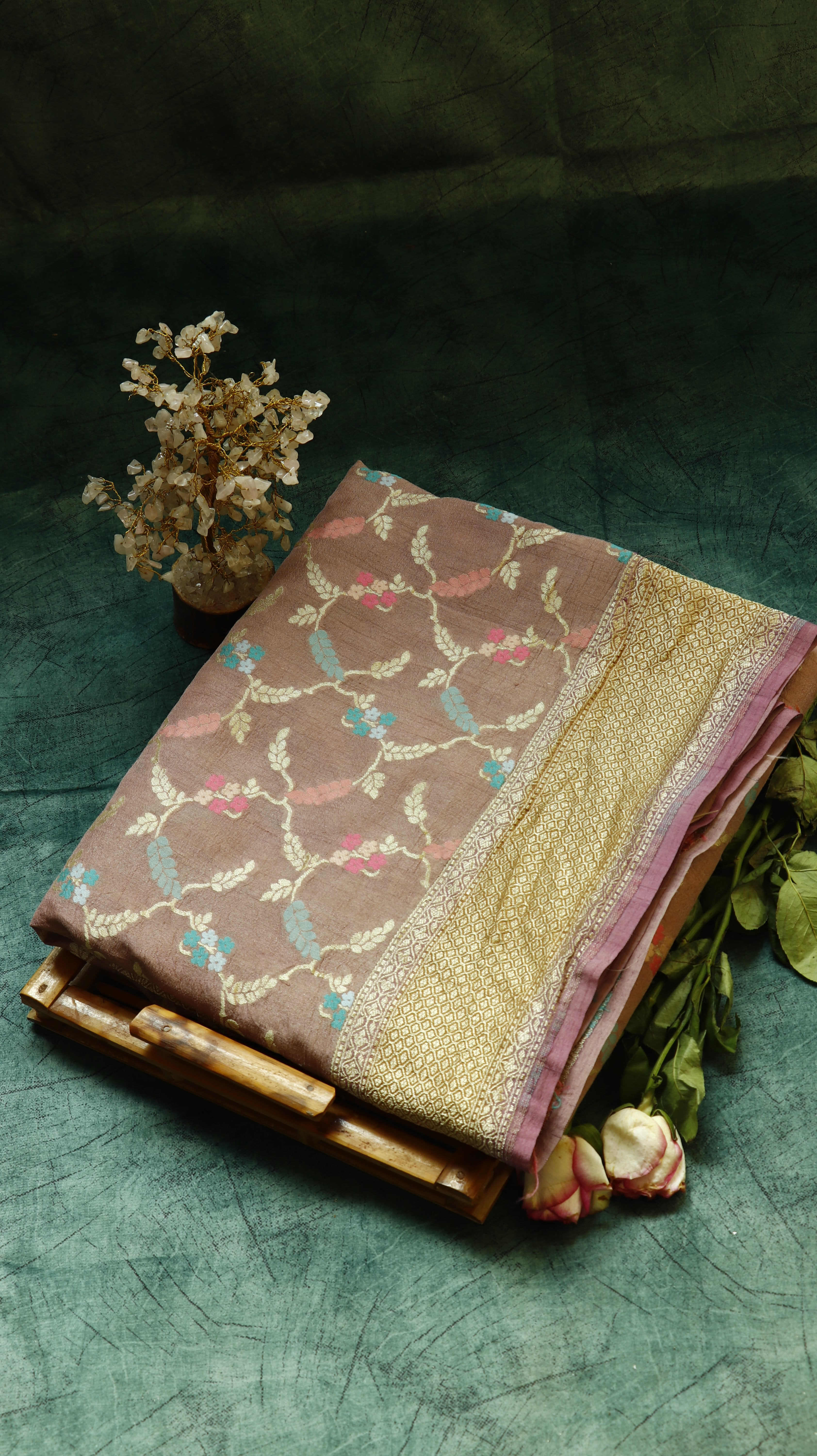 An elegant dusty rose Banarasi saree adorned with pastel floral motifs and a traditional golden zari border. Crafted to reflect timeless grace, this saree is ideal for festive gatherings and cultural celebrations.